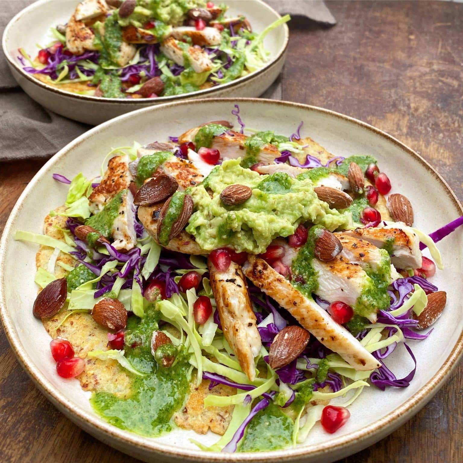 Æggewrap med kylling og pesto Æggewrap med kylling og pesto Opskrift til 12345678910 personer Opskrift til 2 personer Forberedelsestid 20 minutterTilberedningstid 10 minutterSamlet tid 30 minutter Del Pin Print BeskrivelseNem og lækker opskrift på sund æggewrap med kylling og grøn pesto dressing.Den er derudover fyldt med spidskål, granatæble og saltmandler.IngredienslisteÆggewraps 2 stk. æg 0,5 dl. mælk 30 g. mandelmel saltFyld 60 g. spidskål 280 g. kyllingebryst salt/peber 1 stk. avocado 0,25 stk. granatæble 30 g. saltmandlerPersillepesto 1 bundt frisk persille 1 fed hvidløg 1,5 dl. raps- eller solsikkeolie 20 g. solsikkekerner saltLæg i kurven til - + Læg i kurv hos Nemlig.com Lægger i kurv... I samarbejde med Nemlig.comFremgangsmådePisk æg, mandelmel, mælk og salt sammen.Opvarm en pande. Kom halvdelen af æggemassen på panden og strøg dejen ud som en pandekage. Vend æggepandekagen efter cirka 2 minutter.Gentag med den anden halvdel af dej.Steg nu kyllingebryst i lidt fedtstof og kom godt med salt og peber på.Sæt kyllingen til side.Nu skal pestoen laves. Blend persille, olie, salt, hvidløg og solsikkekerner med en stavblender, i en minihakker, foodprocessor eller blender.Anret dine æggewraps på to tallerkener. Hak spidskål fint. Kom det oven på dine æggewraps.Skær kylling i strimler eller tern og kom det ovenpå spidskålen.Fjern stenen fra avocado og skrab avocadoen ud. Mos den og smag til med lidt salt/peber.Pil granatæblet.Top med avocado, granatæble og saltmandler.Hæld din pesto over og server med det samme.Lås skærmOpskrift på æggewrap med kylling og pestoEn sund, lækker og mættende æggewrap med kylling, pesto, avocado og saltmandler. Det her er så lækkert et måltid, som kan spises som sund aftensmad eller sund frokost. Selve bunden er en æggewrap, som bliver toppet med spidskål, stegt kylling, granatæblekerner, saltmandler og avocado. Som dressing har vi lavet en tynd persillepesto, som virkelig lige er prikken over i’et i retten. Den her ret er en kæmpe favorit for tiden!LÆS OGSÅ: Salat med falafel og søde kartofler Æggewrap opskriftVi har i denne æggewrap opskrift valgt at lave den som en åben wrap. Så kan man nemlig få meget mere fyld på! Men du kan selvfølgelig også bare lave den som en almindelig wrap og undlade at putte så meget fyld i. Hvis du ikke er til æggewraps, så kan du også erstatte med en almindelig tortillapandekage. Selve æggewrappen har vi lavet på æg og mandelmel samt lidt salt. Det giver en fast wrap, som er en perfekt base for alt fyldet, da den heller ikke bliver alt for tynd.Vi har som sagt toppet med kylling, men du kan sagtens erstatte kylling med oksekød, laks, koteletter skåret i strimler eller tun. Du kan også lave den som vegetar og bruge falafler eller blot udelade at putte kød i. Selve fyldet er nemlig også super lækkert i sig selv uden kød. I stedet for mandler, så kan du også bruge saltristede solsikkekerner eller græskarkerner. Vi har dog altid saltmandler, så det var nemt lige at toppe med dette.Følg også med på de sociale medierFølger du med på vores Instagram? Hop endelig ind og følg med i vores madunivers. Her vil du få daglig inspiration til søde sager, sundere alternativer, lækre og nemme aftensmadretter og meget mere.