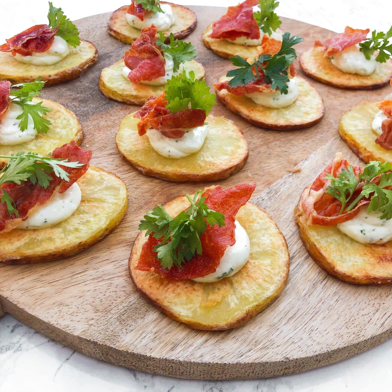 Hej Camilla,Det er meget forskelligt alt efter hvor store bagekartofler er. De skal skæres i ca. 0,5 cm. tykkelse. Vi får 6 ud af én 🙂KhSvar