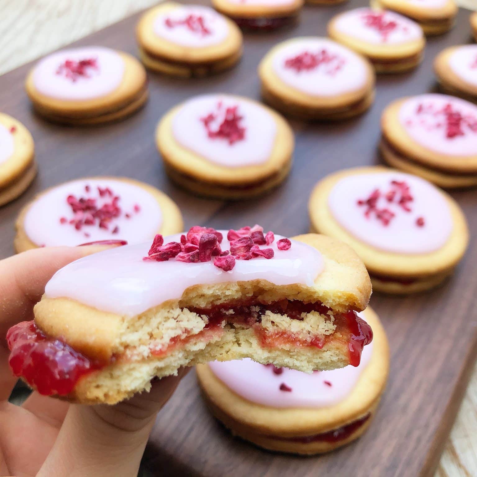 Her får du en super nem opskrift på sprøde og lækre hindbærsnitter. De er lavet med sprød mørdej, hindbærmarmelade og lyserød glasur. Sådan en hjemmelavet hindbærsnitte er altså skøn til kaffen eller som en del af et større kagebord. Du kan pynte dem præcis, som du vil. Vi har toppet dem med lyserød glasur samt frysetørrede hindbær. Du kan også lave dem helt klassiske med hvid glasur og tivolikrymmel.