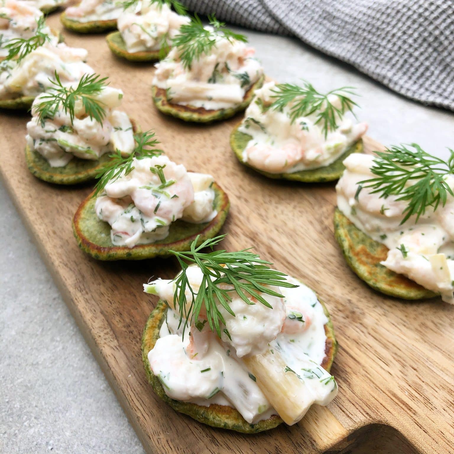 Spinatblinis med rejesalat, som er en nem lille appetizer, forret eller snack. Du får de skønneste små grønne blinis med rejesalat, som er så fine at servere som forret eller som en del af et større tapasbord. Blinispandekagerne er lavet med spinat og så er de toppet med en hjemmelavet rejesalat, som er lavet med creme fraiche, frisk dild, rejer og asparges. Det er en dejlig og smagfuld rejesalat.